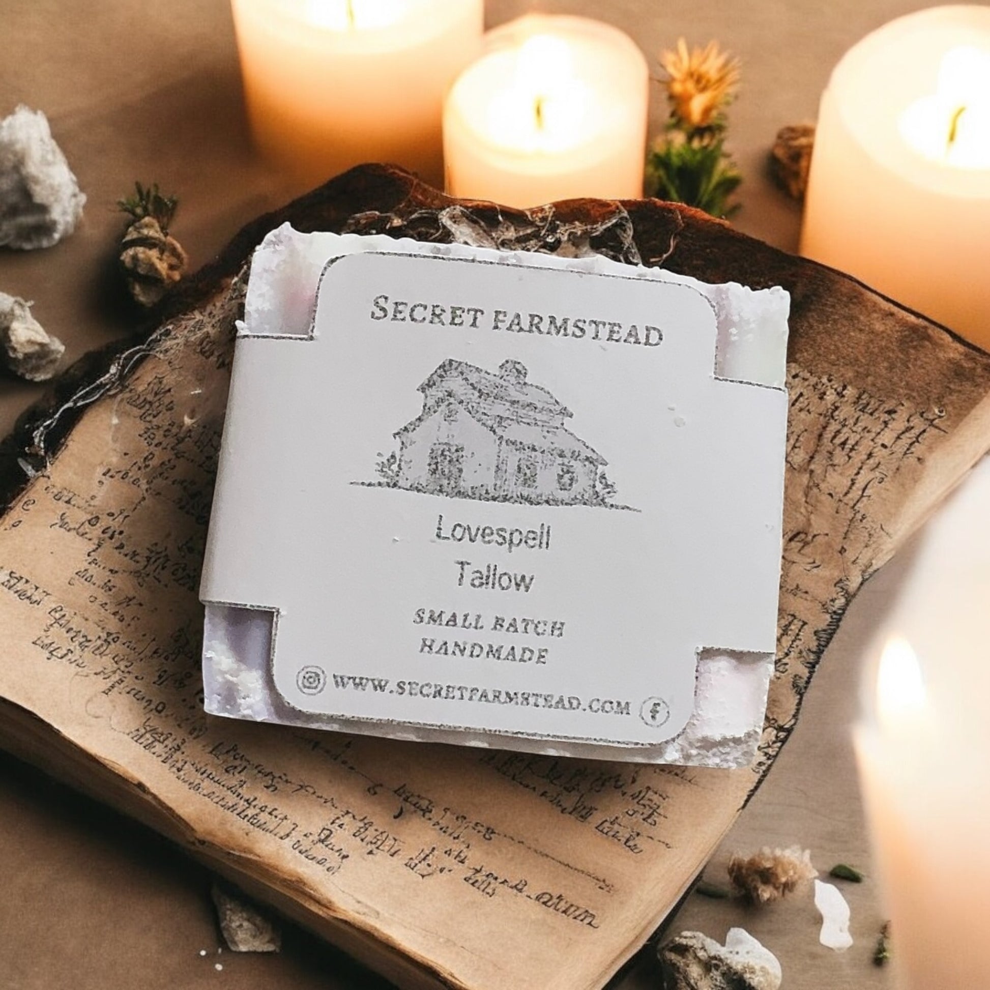 Step into a world of romance and mystery with Love Spell, a handcrafted tallow soap designed to awaken the senses and stir the heart. This luxurious bar wraps your skin in a creamy, nourishing lather while casting a fragrant spell of passion.